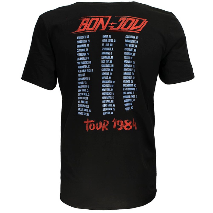 This Bon Jovi Official 1984 Tour T-Shirt is the original tour T-Shirt of the American rock band Bon Jovi from when they went on tour in 1984. For fans of Jon Bon Jovi, this T-Shirt should not be missing in the collection. wardrobe.