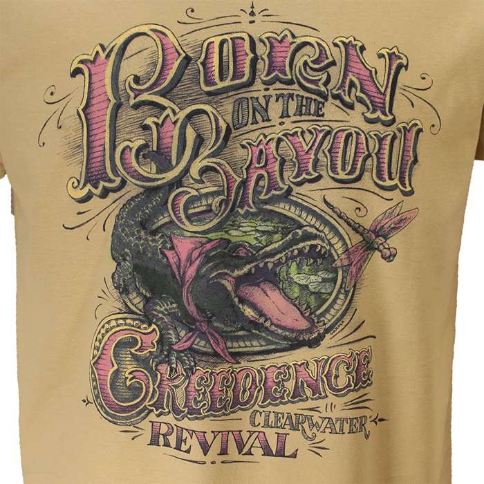An officially licensed Creedence Clearwater Revival Born on the Bayou T-Shirt available in various sizes. This T-Shirt is a Classic unisex fit soft-style cotton shirt with a crew neck collar and short sleeves. The shirt has the Born on the Bayou print on the front. the Bayou design.