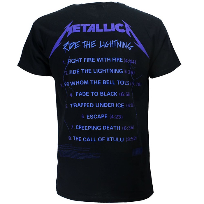 The shirt features the iconic album cover on the front and the full tracklist of the album on the back, offering a complete representation of Ride The Lightning . Made from high-quality, soft cotton, this t-shirt is not only comfortable but also durable, perfect for both concerts and everyday use.