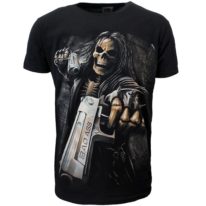 This black T-shirt has an image of a skeleton “hitman” with long hair and a long coat. He has two pistols in his hands with the word Badass engraved on them. The back of the t-shirt has the same print. A very cool design!