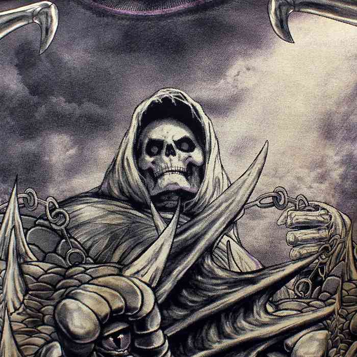 This Rock Eagle T-Shirt features an image of the Grim Reaper sitting atop a large two-headed snake-like dragon, trying to restrain it with chains. This shirt has an all over print, because as you can see the print also runs down the sleeves. The back of the t-shirt has the same print