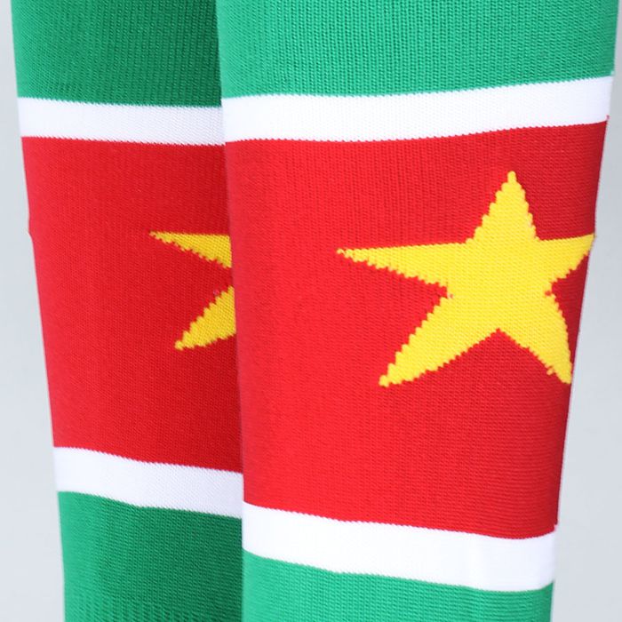 Super nice soccersocks from Suriname! The socks are available in different sizes and they are made of the highest quality. The socks are very comfortable to wear and are very suitable to wear when playing football. The socks are green in color and also contain the colors yellow and red.